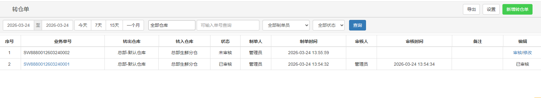在转仓单列表中,默认显示今天本门店的所有的转仓单。
