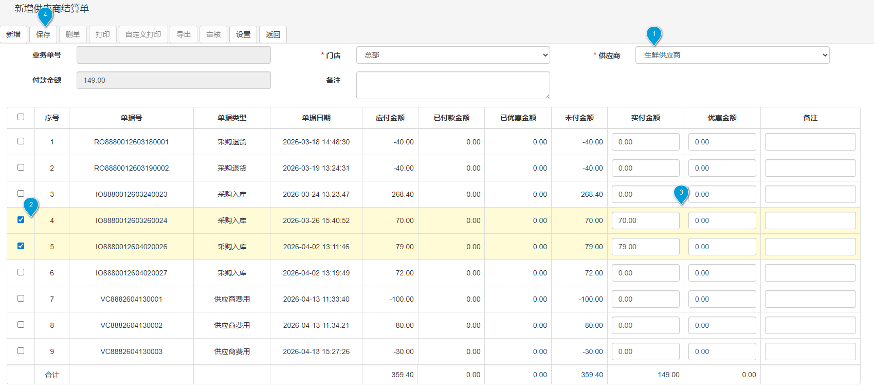 选择供应商(系统自动列出该供应商所有未结算的账款单),系统自动展示与该供应商相关的未结算明细,包括:采购收货单(应付金额)、采购退货单(应收金额,显示为负数)、供应商预付款单(已付金额,冲减应付)、供应商费用单(应付/应收费用),勾选需要在本期结算的单据。
