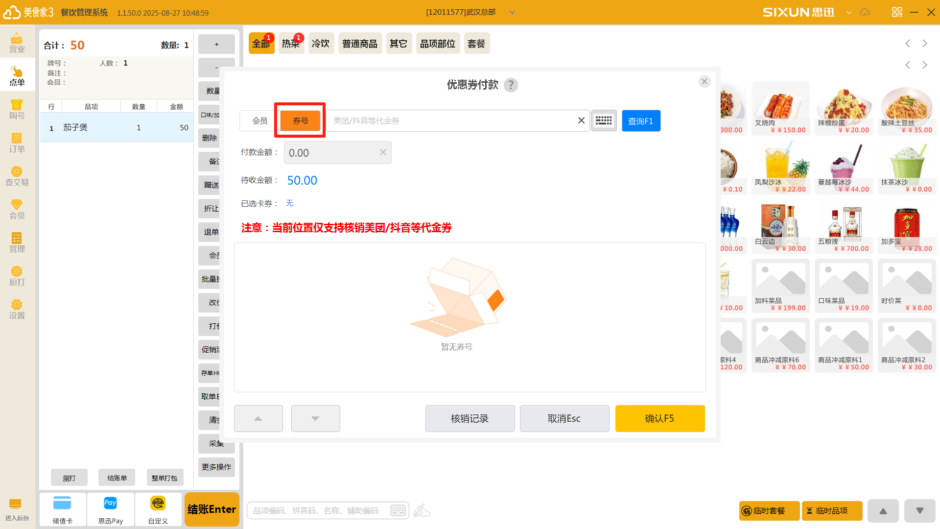 3.3 快餐具体操作方式:门店前台POS点单界面,无需点菜,点击“前置核券”,扫描顾客手机端出示的团购券码,完成核销。