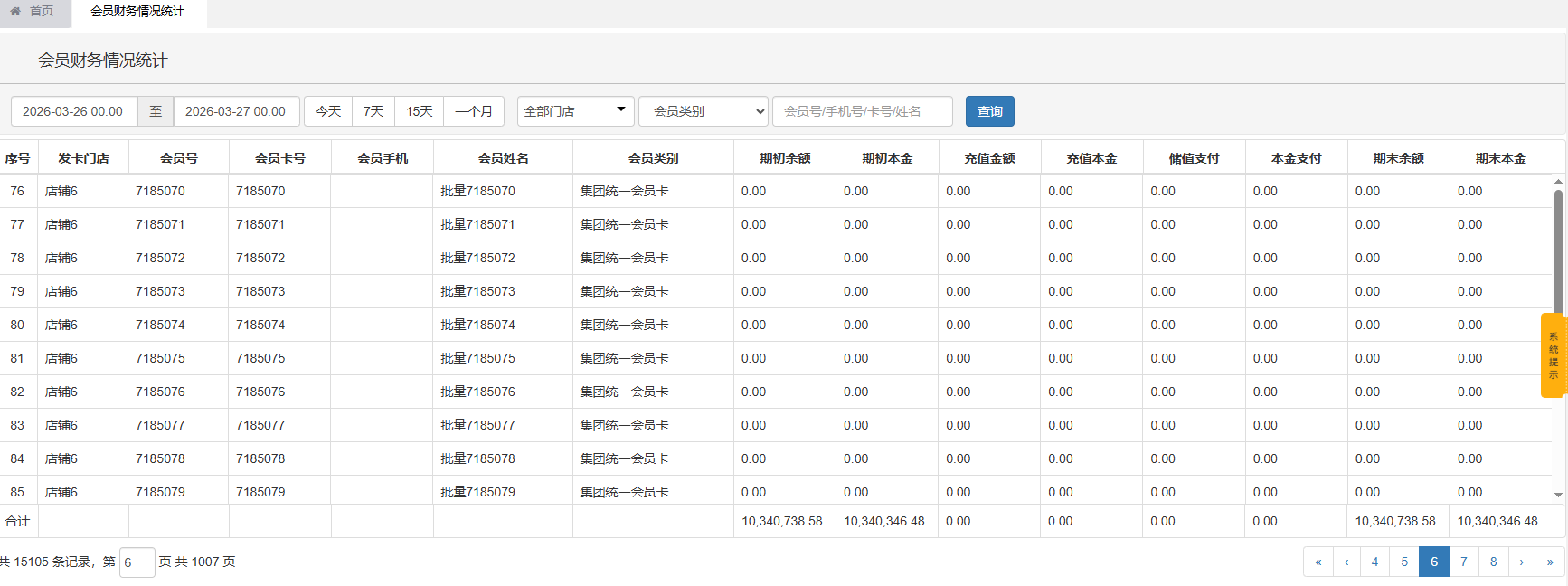查询门店会员储值金额数据,如期初本金、充值金额、充值本金、储值支付、本金支付、期末余额、期末本金。