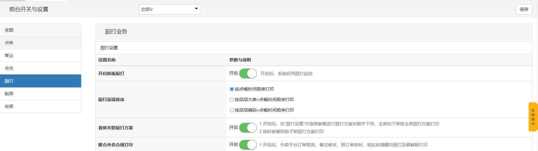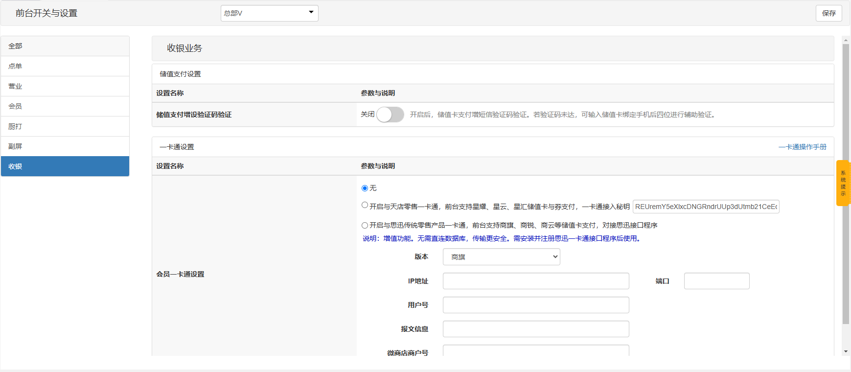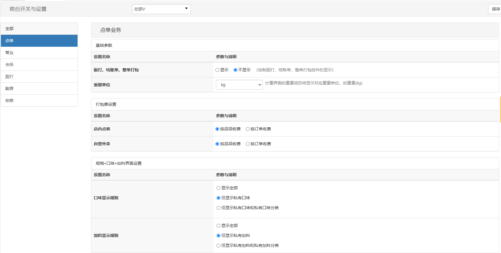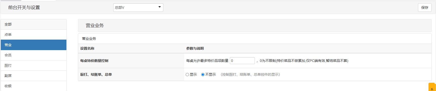 用于控制pos前台相关功能参数使用,截图中相关参数都附带有使用说明。