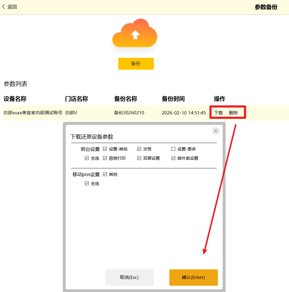 参数备份可以把门店所有的设置参数备份到服务器;参数备份包含前台的小票,总单,厨打的打印设置以及交班,双屏,取餐号,微外卖以及移动pos 的设置等