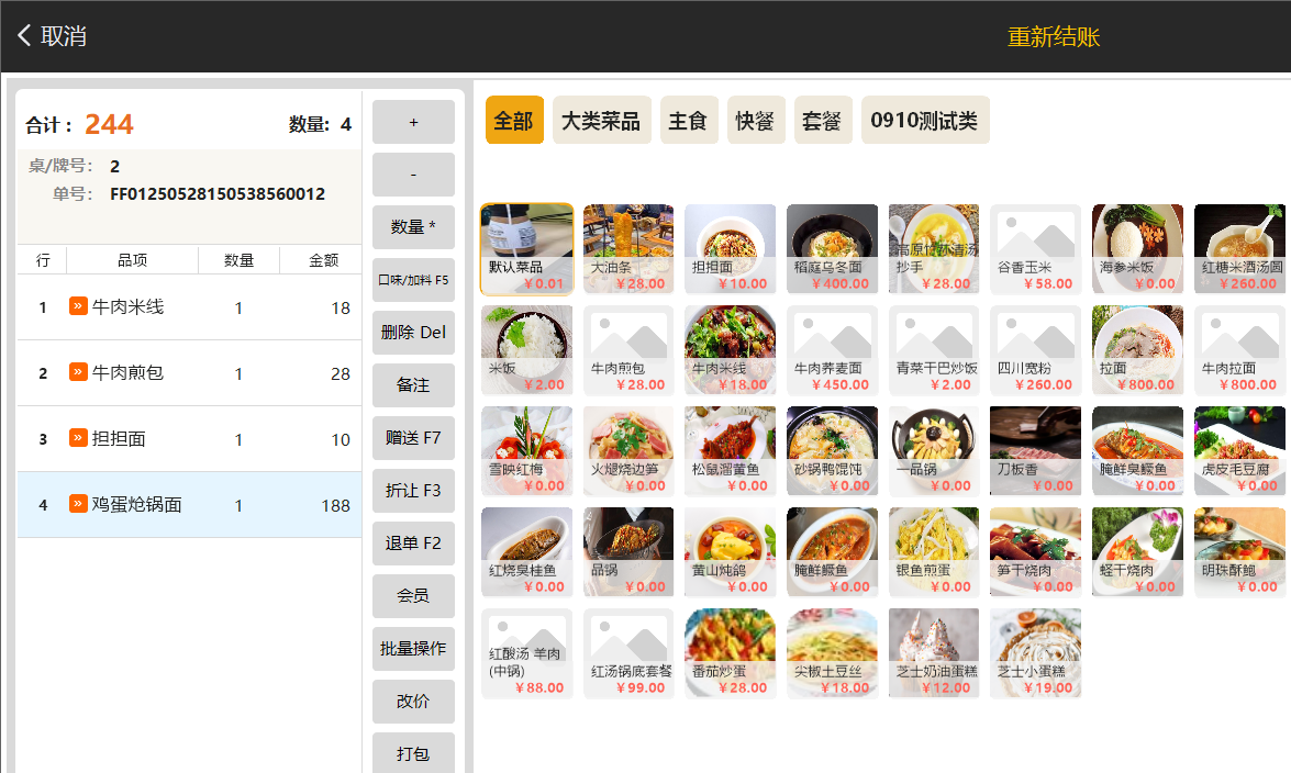 (4)退款成功后点单模式的订单会自动进入点单界面并生成新的待结算订单,重新修改确认无误后结账即可。