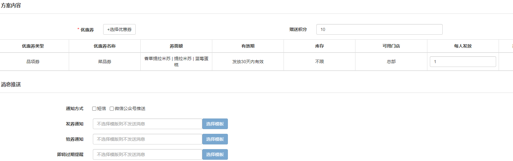 优惠券:选择已创建好的品项券或代金券。