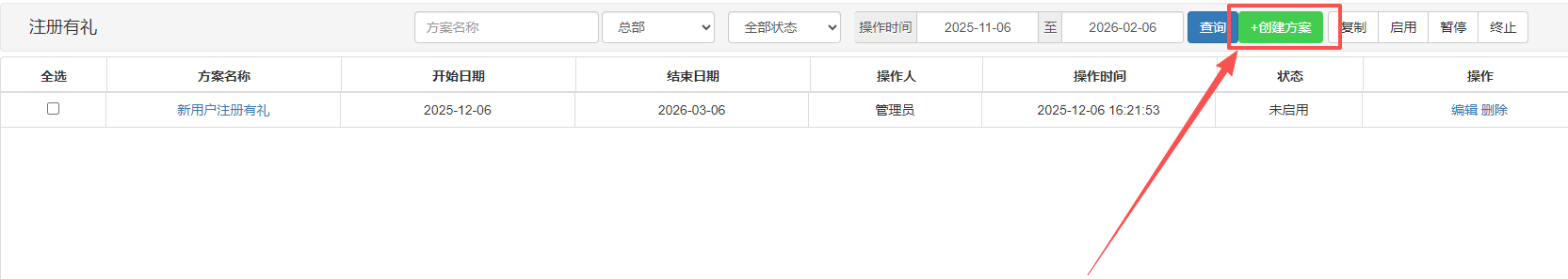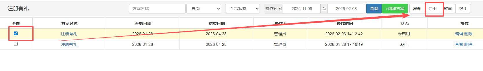 方案创建并保存后,默认状态为“未生效”。需手动点击【启用】,活动方可在前端生效。