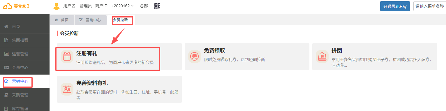 位置: 【营销中心】 -> 【会员拉新】 -> 【注册有礼】