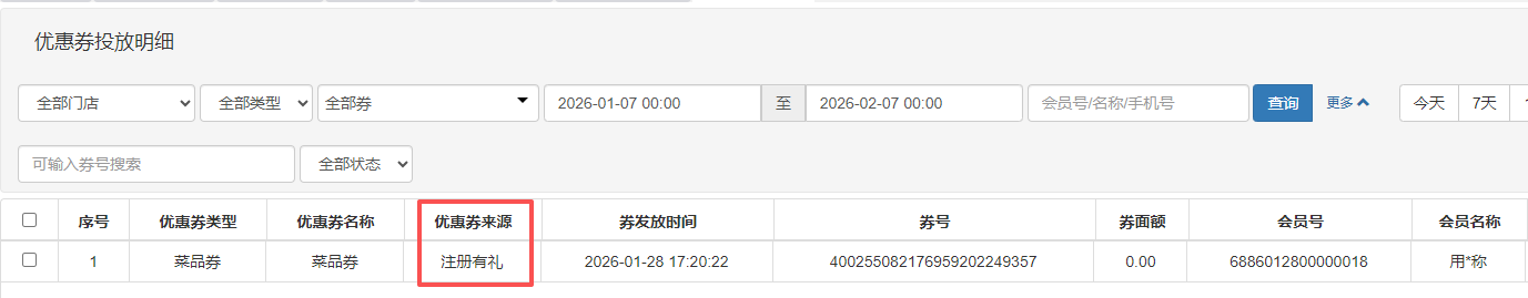 进入【营销中心】->【优惠券管理】->【投放明细】,可查看所有通过“注册有礼”活动发放的优惠券记录,包括优惠券类型、名称、来源及发放时间等。