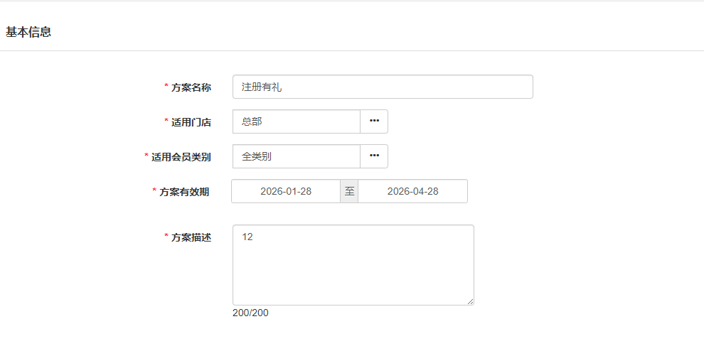 在方案内容中,设置新会员注册成功后系统自动发放的奖励: