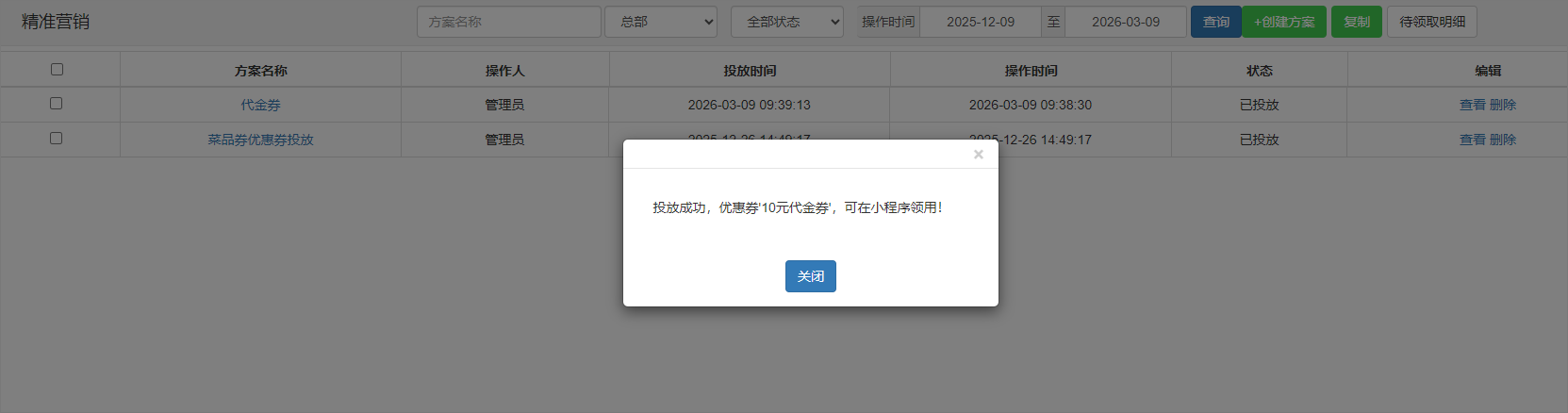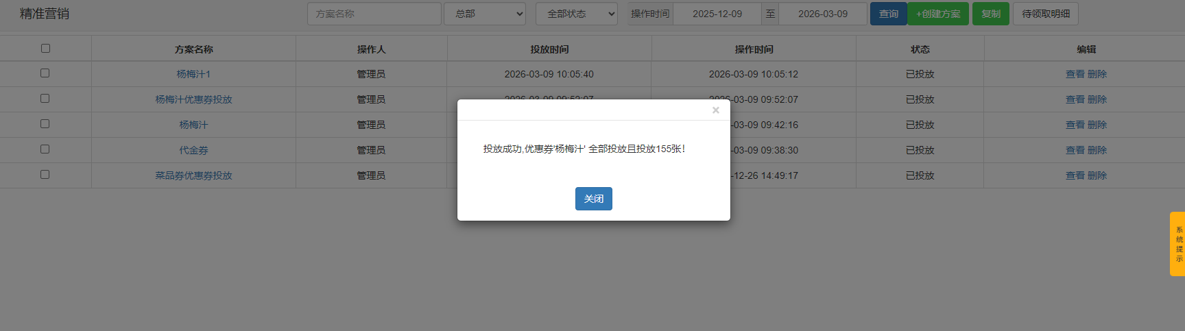 3、保存并投放活动,活动创建成功后默认是未投放的状态,需要点击投放并确认投放后优惠券将自动发送,发放成功后也会有对应提示:“投放成功xxx优惠券多少张”。