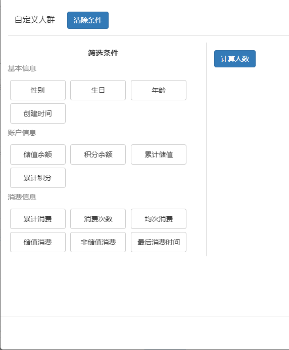 投放人群:包含常用人群(可选择全部会员、30天内未消费会员、只消费一次会会员),指定人群(可手工指定会员),自定义人群(可根据会员的基本信息,账户信息或消费信息进行筛选会员)