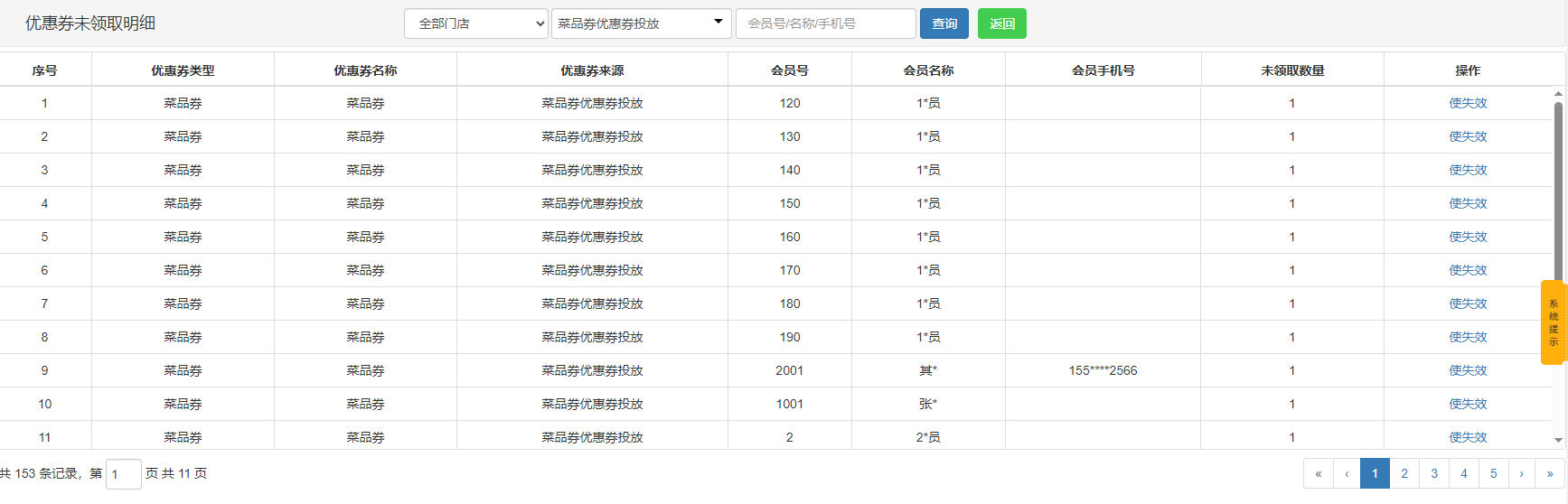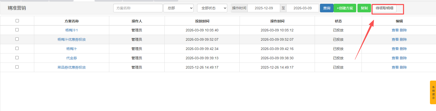 在后台精准营销待领取明细中点击即可查询到已经发放未领取的优惠券。