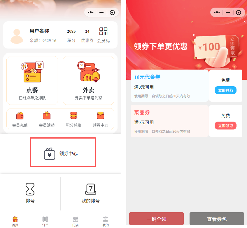会员领取:会员进入“微餐厅”小程序,点击首页的“领券中心”入口,领取对应优惠券。