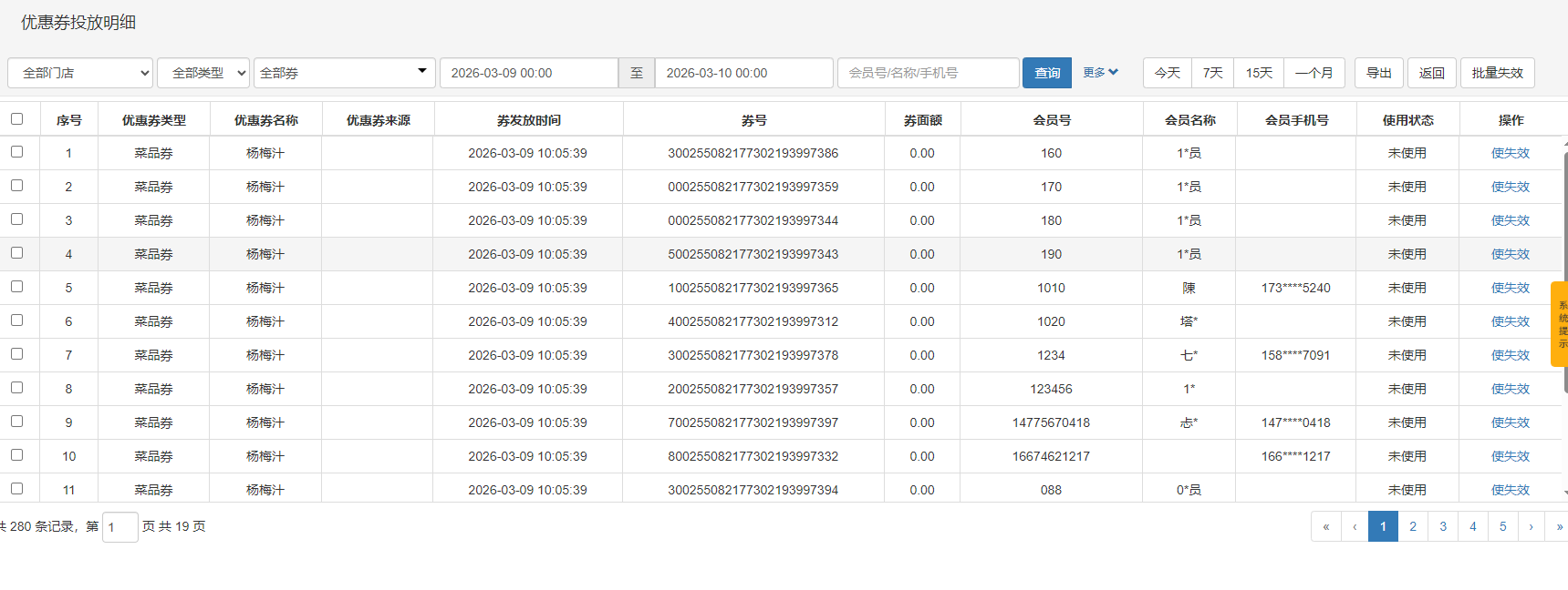 在后台优惠券管理中点击投放明细即可查询到已经发放的优惠券。