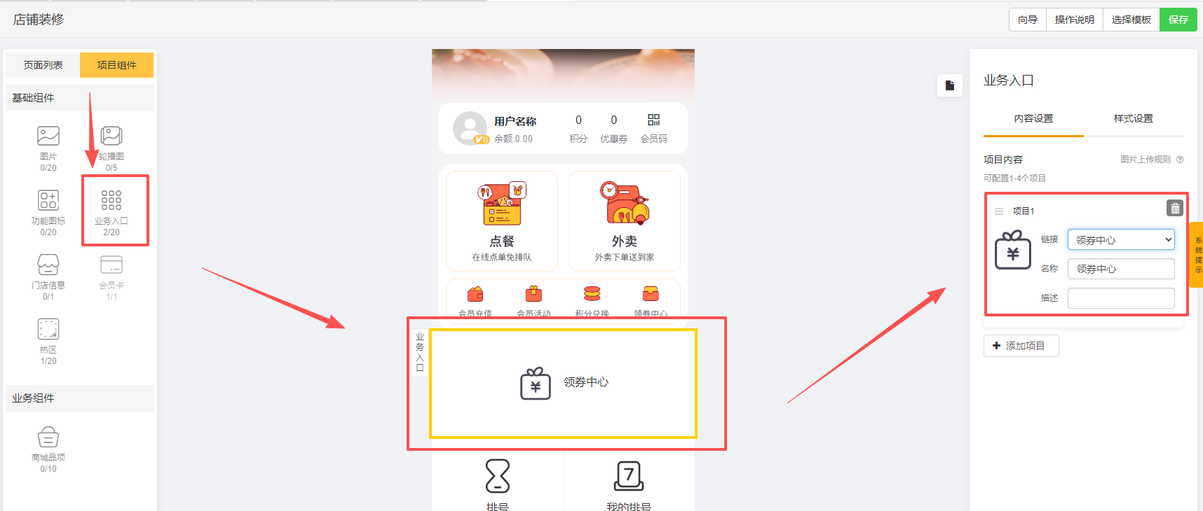 配置入口:需先在【微餐厅设置】->【店铺装修模板】的“项目组件”中,添加“领券中心”业务入口。