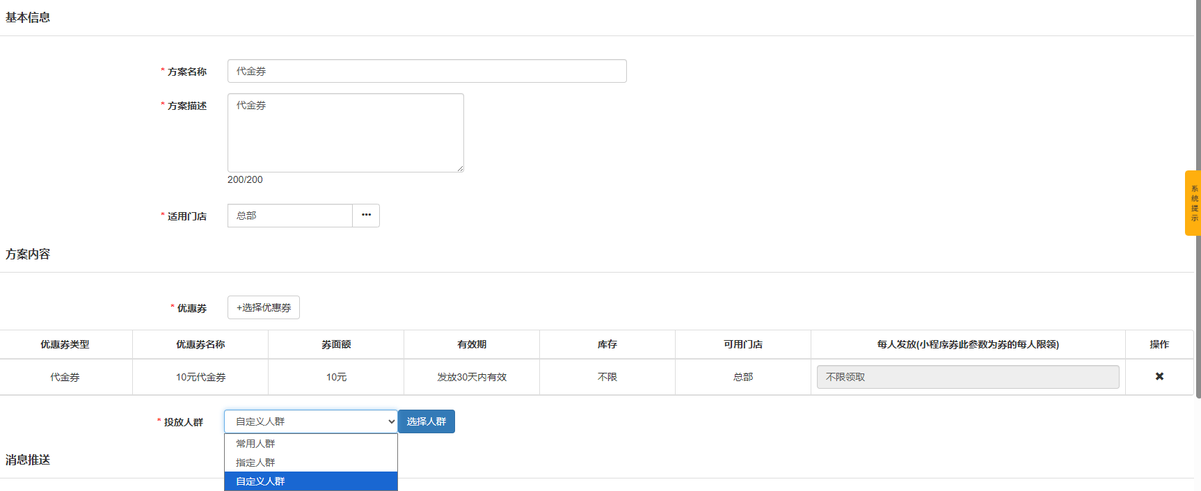 2、填写基本信息并设置方案内容,包含方案名称,方案描述,适用门店,优惠券以及投放人群等。