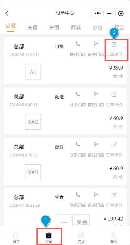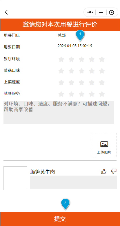 订单中心:进入“微餐厅”小程序【订单中心】,找到已完成订单,点击【去评价】按钮。