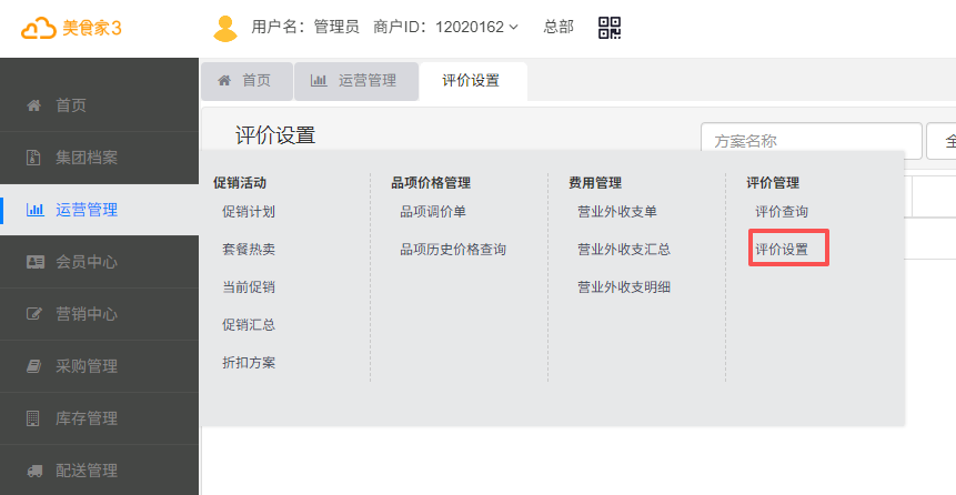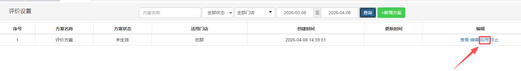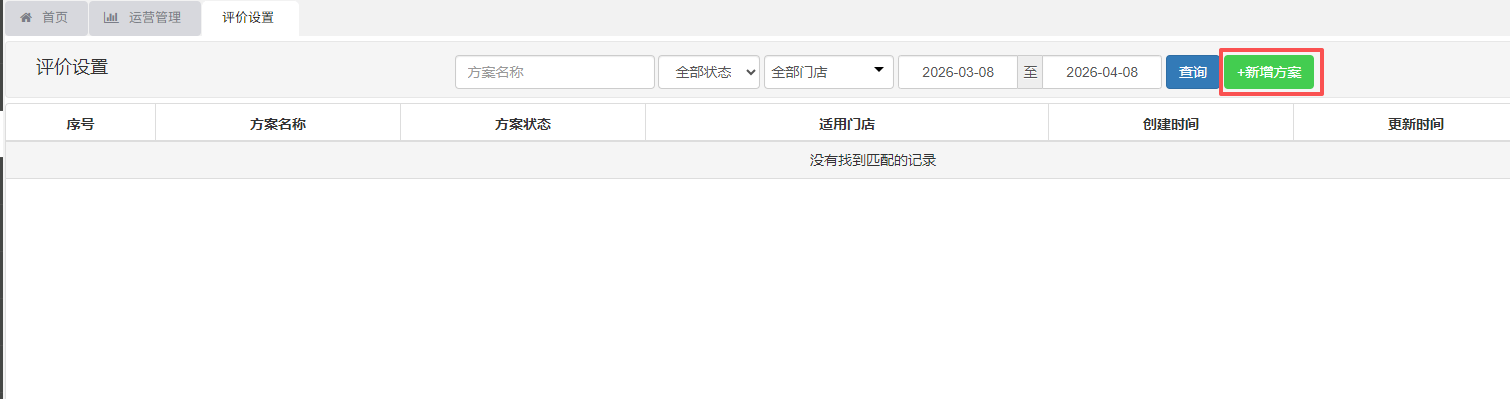 在后台【运营管理】->【评价管理】中,选择【评价设置】,点击【新增方案】。
