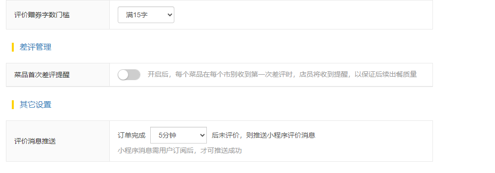 菜品首次差评提醒:开启后,每个菜品在每个市别收到第一次差评时,店员将收到提醒,以保证后续出餐质量;