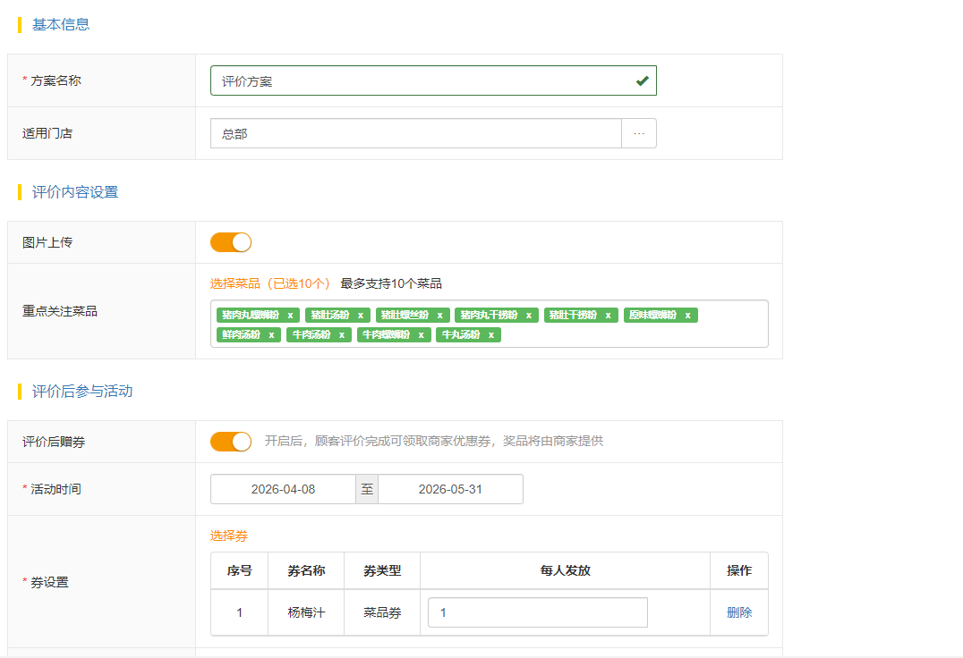 评价后赠送券:设置消费者完成评价后可获得的奖励(如优惠券)。
