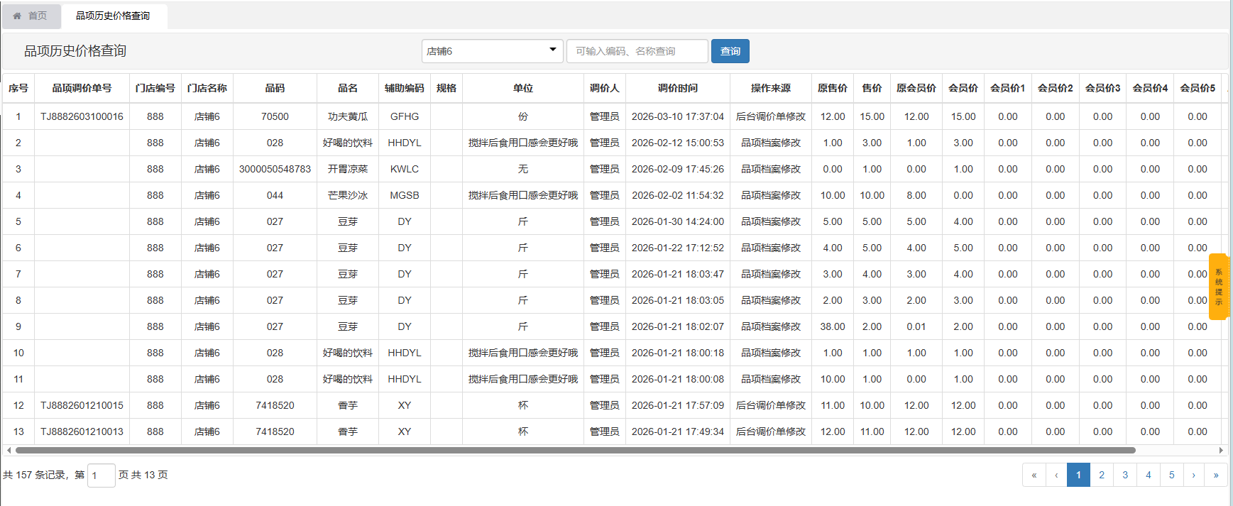 功能概述:用于查询连锁门店所有品项档案的历史价格,支持筛选门店、输入品项编码、品项名称进行查询;本表包含:品项调价单号、门店编号、门店名称、品码、品名、辅助编码、规格、单位、调价人、调价时间、操作来源、原售价、售价、原会员价、会员价1-会员价5。