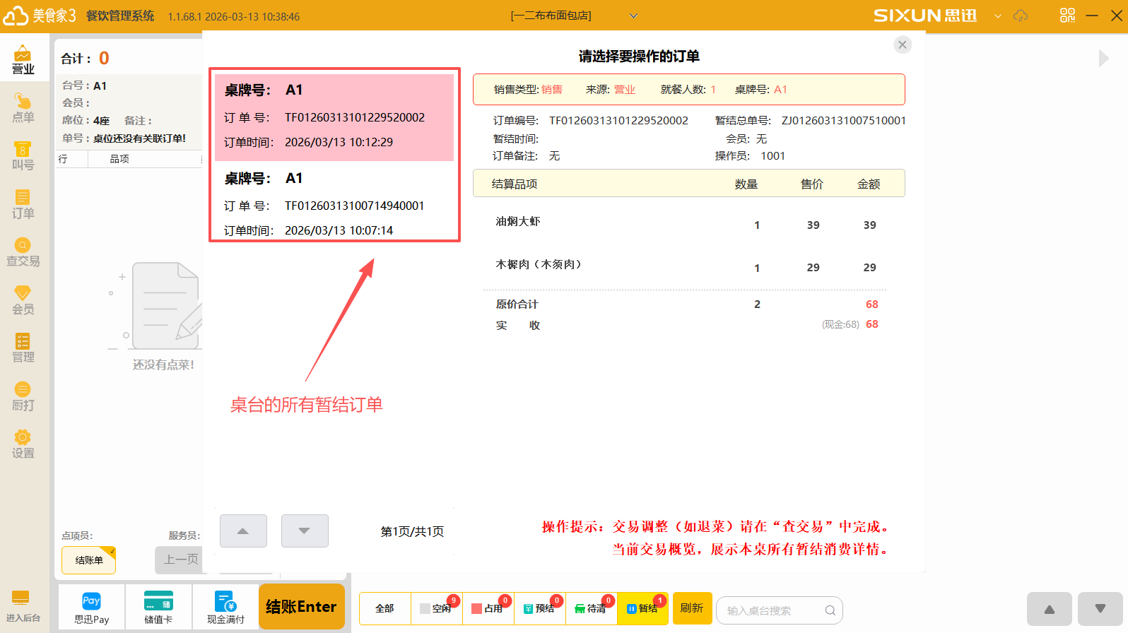 6、查看暂结订单:选中暂结桌台-点击更多操作-点击“暂结消费”,跳转到暂结订单页面,可查看桌台所有暂结订单的详细信息,如需要反暂结,可以到查交易界面,找到对应订单操作“重新结账”进行反暂结、打印操作。