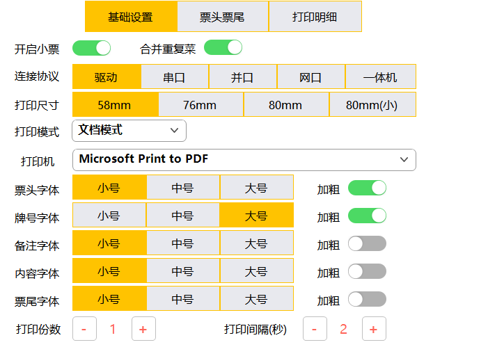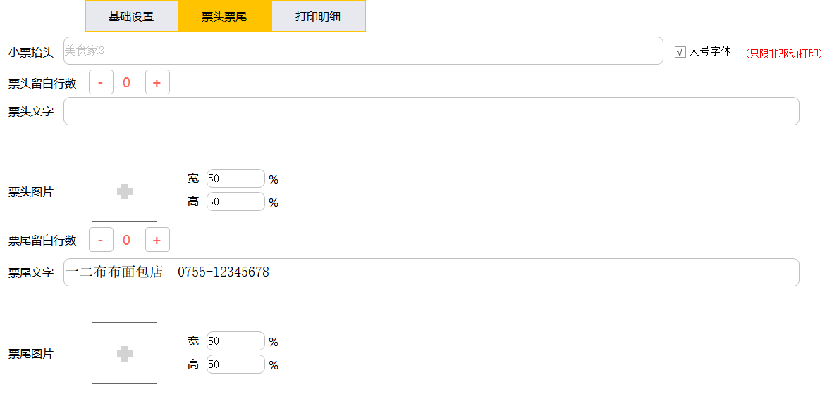 票头字体:点击“小号”、“中号”、“大号”三种字体选择指定打印的字体型号,可设置字体加粗。