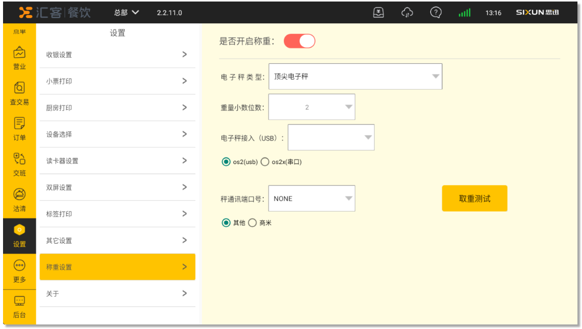 称重设置 称重设置开启称重及计价秤的基本设置。 电子秤类型支持:顶尖、大华电子秤ACS-15Ab、龙飞电子秤、顶尖点餐OS2、商米S2一体秤;重量小数位:电子秤接入(USB):秤通讯串口号: 如图所示 文档更新时间: 2026-03-20 06:15 作者:zhouxiao