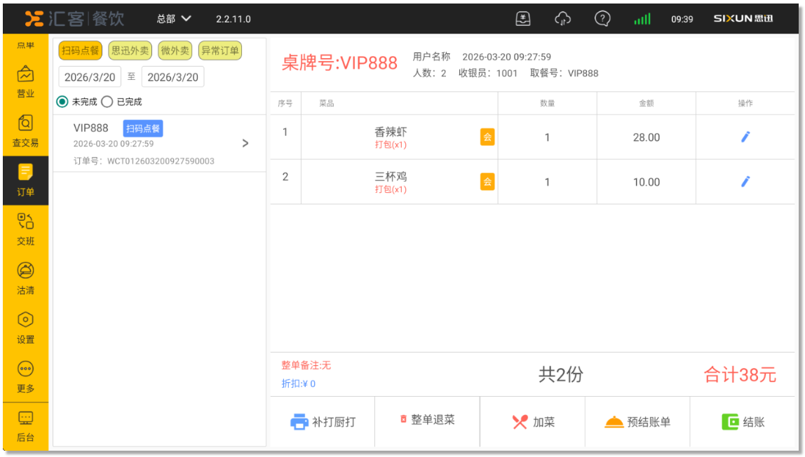 - 未完成:订单未支付,可完成补打厨打、整单退菜、加菜、预结账单、结账等操作;