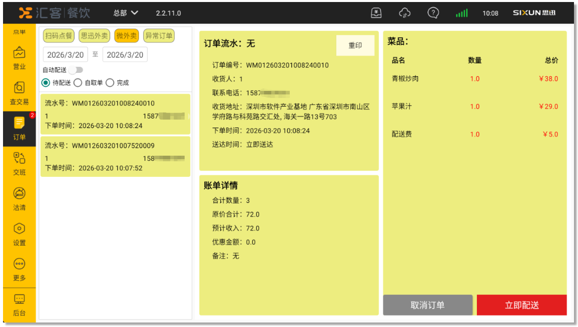 - 待配送:未开启自动配送,待配送订单需点击立即配送并选择对应配送员后,订单在已完成显示;