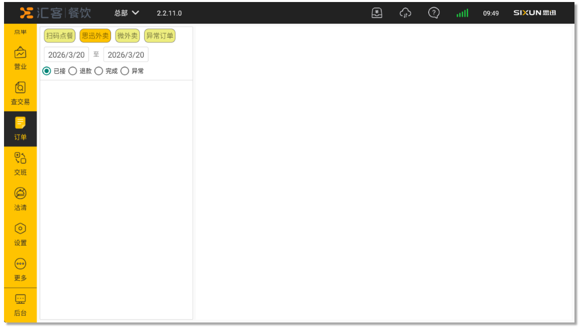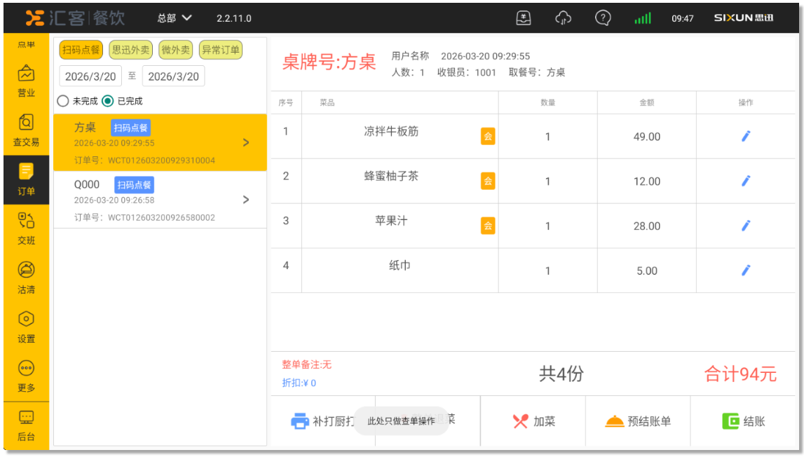 - 已完成:订单已完成支付,可补打厨打及查看订单明细核对;