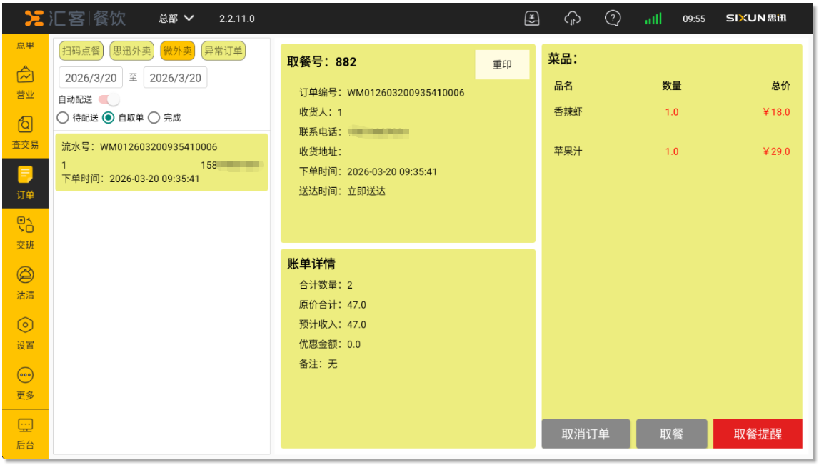 - 自取单:自提订单可操作取消订单,取餐、取餐提醒业务;取消订单默认原路返回;