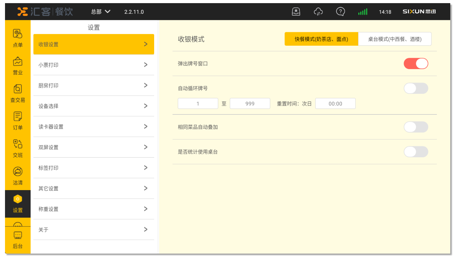 目录 搜索 汇客餐饮·学习指南汇客餐饮·后台管理一、系统功能概述二、使用须知三、登录系统四、开店向导五、后台首页六、档案6.1 品项类别6.2 品项档案6.3 品项口味6.4 规格管理6.5 原料管理6.6 品项加料6.7 品项单位七、促销7.1 促销计划7.1.1 促销计划-特价7.1.2 促销计划-折扣7.1.3 促销计划-买一赠一7.1.4 促销计划-第二份半价7.1.5 促销计划-满减7.1.6 促销计划-满量7.1.7 促销计划-满赠7.2 套餐热卖7.3 当前促销7.4 促销汇总八、会员8.1 会员资料8.2 会员类别8.3 会员设置8.4 会员积分8.5 会员储值8.6 充值赠送8.7 小额储值8.8 优惠券8.9 会员挂账结算8.10 精准营销8.11 消费满额送券九、门店9.1 门店管理9.2 店员管理9.3 桌位管理9.4 pos授权十、采购10.1 入库单10.2 采购申请单10.3 入库明细10.4 入库汇总十一、库存11.1 品项库存11.2 原料库存11.3 盘点单11.4 报损单十二、报表12.1 收银情况查询营业汇总收银流水收银汇总收银员汇总付款方式汇总上缴金额报表订单查询12.2 品项销售查询品项销售流水品项销售汇总退菜记录品项赠送品项赠送明细连锁销售排行品项毛利汇总12.3 储值分析会员储值汇总会员储值明细储值卡支付记录12.4 会员消费会员消费汇总会员消费明细会员挂账统计会员财务汇总12.5 营销活动报表优惠券营销明细优惠券营销汇总十三、设置13.1 支付设置13.2 商户资料13.3 数据清理13.4 个人账号13.5 餐道外卖设置13.6 销售设置13.7 短信设置13.8 抖音设置抖音团购券十四、扫码点餐14.1 扫码点菜设置14.2 商户设置14.3 扫码点餐装修14.4 店铺装修模板扫码点餐使用流程十五、微餐厅15.1 门店小程序码15.2 抽奖设置微餐厅使用流程十六、微外卖16.1 微外卖设置16.2 配送设置微外卖使用流程聚合外卖团购券1、开通和购买流量2、外卖及团购券平台授权绑定3、外卖菜品绑定4、前台订单管理5、团购券套餐管理6、京东外卖7、前台核销美团券十七、下载电子发票发票设置汇客餐饮·Windows前台使用须知登录点菜销售清单菜品信息菜品编辑收款结账营业桌台操作桌台状态菜品编辑菜品操作收款结账订单查交易查订单订单详情交班交班估清沽清会员新增会员查询|读卡挂失换卡修改资料修改密码积分调整储值充值查看优惠券补打小票会员核销管理桌台预订日志酒水寄存营业汇总收银汇总品项销售流水品项销售汇总酒水寄存报表设置小票打印基础设置票头票尾打印明细厨房打印标签打印取餐号快捷键双屏钱箱计价秤条码秤客显读卡器APP下载其他更多进入后台汇客餐饮·安卓POS使用须知登录点单营业查交易订单交班沽清设置收银设置小票打印厨房打印设备选择读卡器设置双屏设置标签打印其他设置称重设置关于更多酒水寄存营业汇总收银汇总品项销售流水品项销售汇总汇客餐饮·安卓手机收银汇客餐饮·云小店汇客餐饮·店小宝常见问题前言一、社区登记问题指南二、安装及登录类问题1、软件实施系统环境检查2、Windows XP 系统上安装运行问题3、Windows 10 系统上安装运行问题4、程序异常类问题5、程序已停止工作类问题6、初始化类问题6.1、数据库初始化失败6.2、服务异常,数据库服务启动异常6.3、链接数据库失败6.4、打开运行后,初始化时在“正在创建数据库用户”卡住不动7、设置主副收银8、登录类问题三、Windows 客户端常见问题1、交班2、小票打印3、思迅 pay3.1 思迅 pay 付款语音播报3.2 门店单独设置思迅 pay4、反结账5、下传数据报错6、前台优惠券的核销7、饿了么配送没有权限四、后台常见类问题1、开通会员储值2、开通会员挂账3、套餐设置4、附加费(茶位费)设置5、时价菜设置6、临时品项设置7、称重商品单位转换8、支付设置9、库存设置9.1 设置品项库存9.2 设置原料库存五、扫码点餐类问题1、获取桌台状态失败2、扫码点餐不能在线支付3、获取线下开单号失败4、餐前支付保留桌台占用状态六、店小宝常见问题1、店小宝多人使用七、安卓 POS 端常见问题1、安卓 POS 端连接 USB 打印机的操作步骤八、运营平台常见问题1、买断账号修改有效期 暂无相关搜索结果! 本文档使用 MinDoc 发布 设置 设置 收银设置 小票打印 厨房打印 设备选择 读卡器设置 双屏设置 标签打印 其他设置 称重设置 关于 文档更新时间: 2026-03-20 08:30 作者:zhouxiao