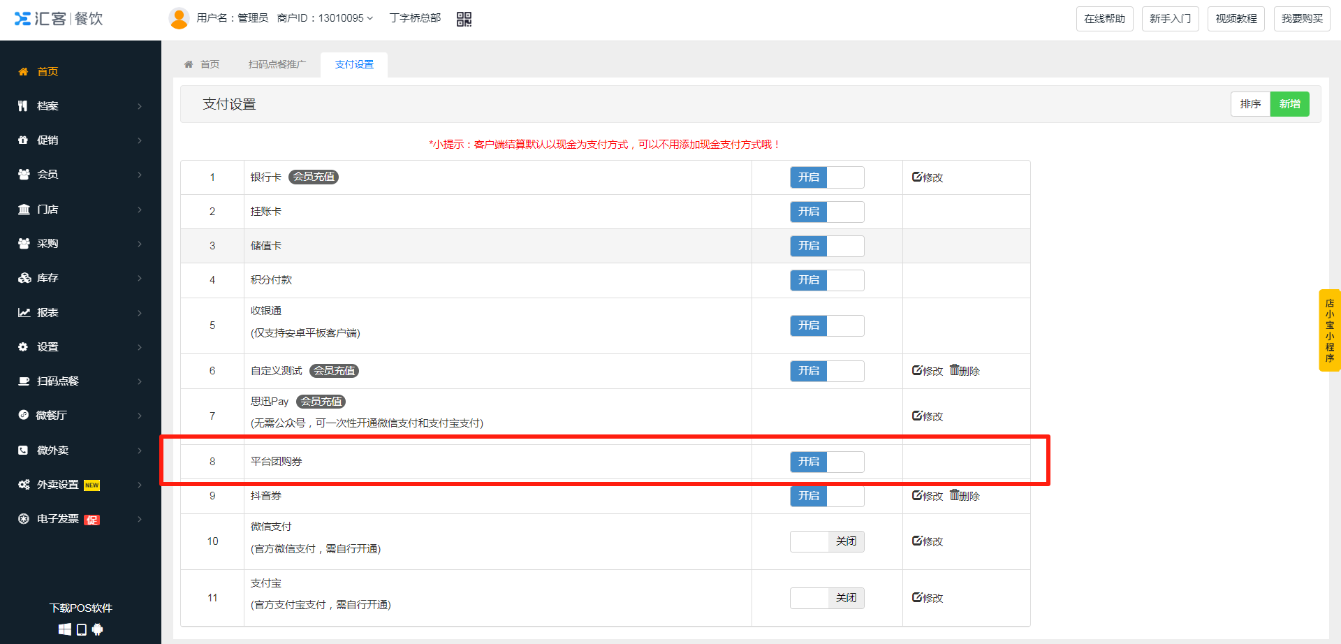 商家后台-系统设置-支付设置,开启平台团购券,前台下载数据。