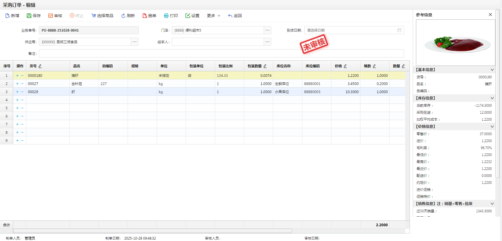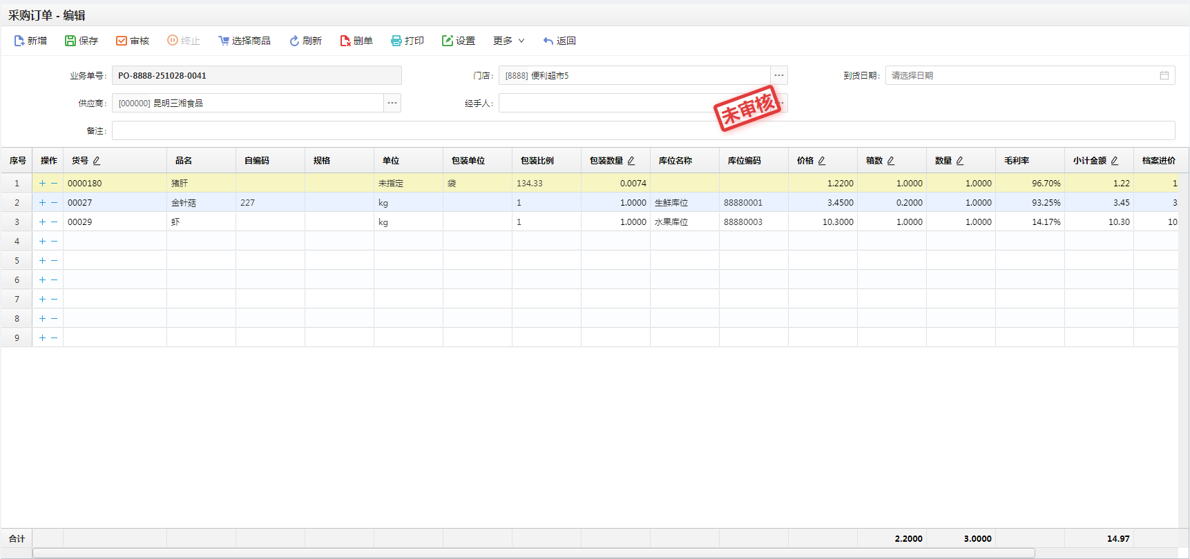 功能:将要采购的商品做好订货单后发给供应商,让供应商按订单发货。注意采购订单保存审核后并不增加库存,订单状态为未收货。