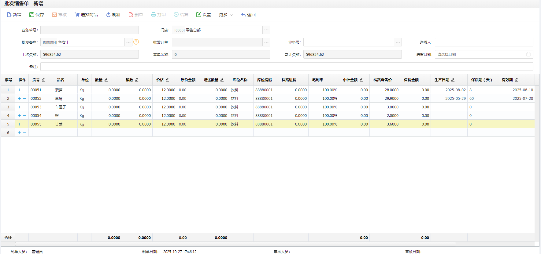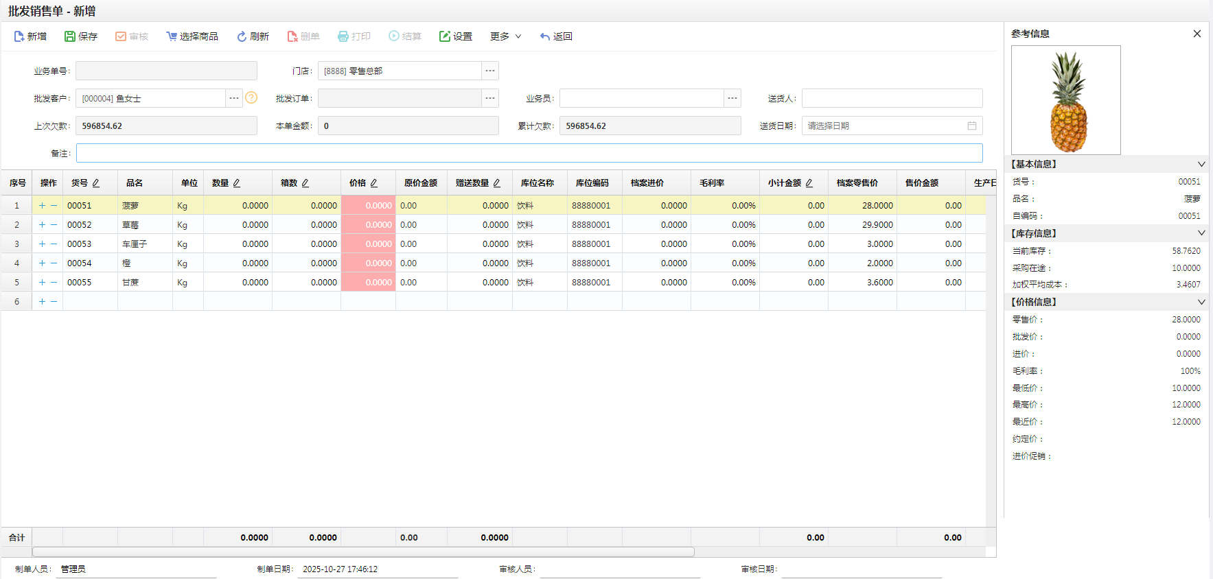 在批发销售单新增界面可以录入批发销售的明细数据。