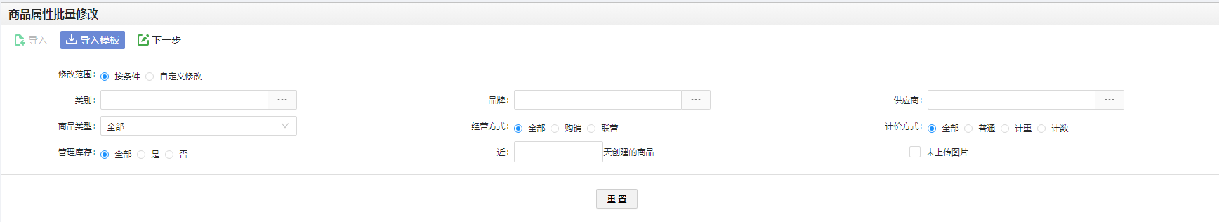 可根据筛选条件缩小需要修改商品的范围,可选择对应类别、品牌、供应商、商品类型、经营方式、计价方式等。