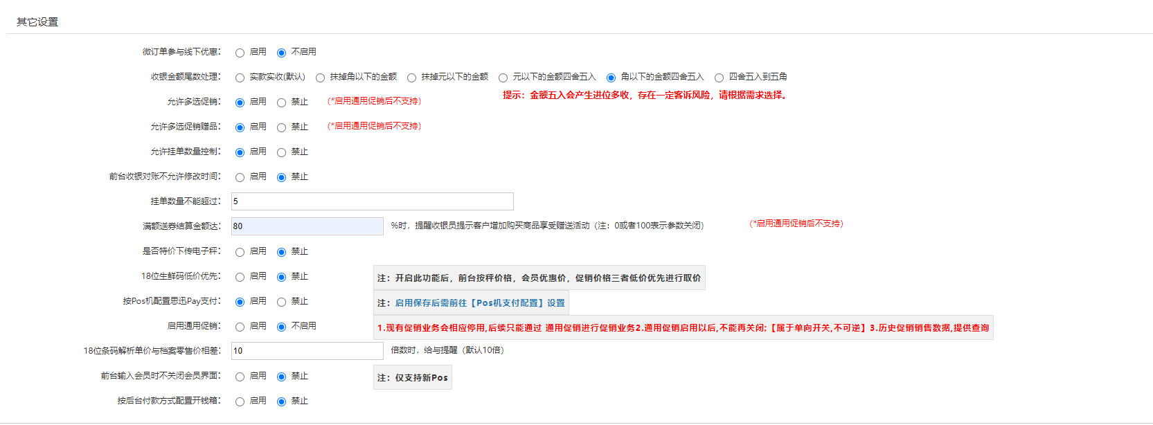 金额四舍五入会产生多收,存在一定客诉风险,请根据实际需求选择。允许多选促销: 启用 禁用