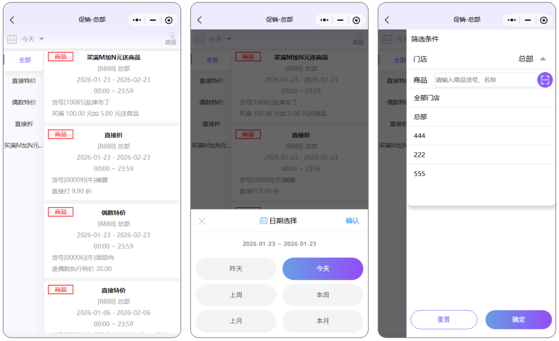 作用:默认显示后台建立的促销计划,可以看到参与促销的商品,支持按时间,门店,商品查询对应促销;