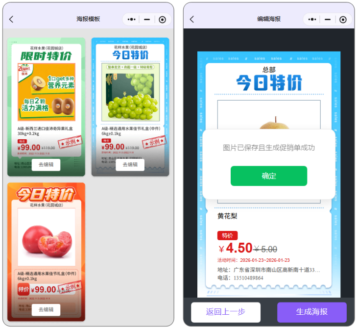 编辑电子海报,生成海报后后台会自动生成促销单。可推广相关的促销优惠。