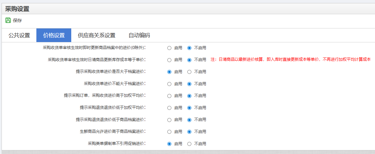2.5 提示采购订单,采购收货进价高于加权平均价: 启用 不启用