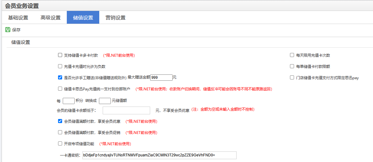 • 充值卡充值时允许为负数:前台会员手工充值允许输入负数,用于冲抵会员储值余额;
