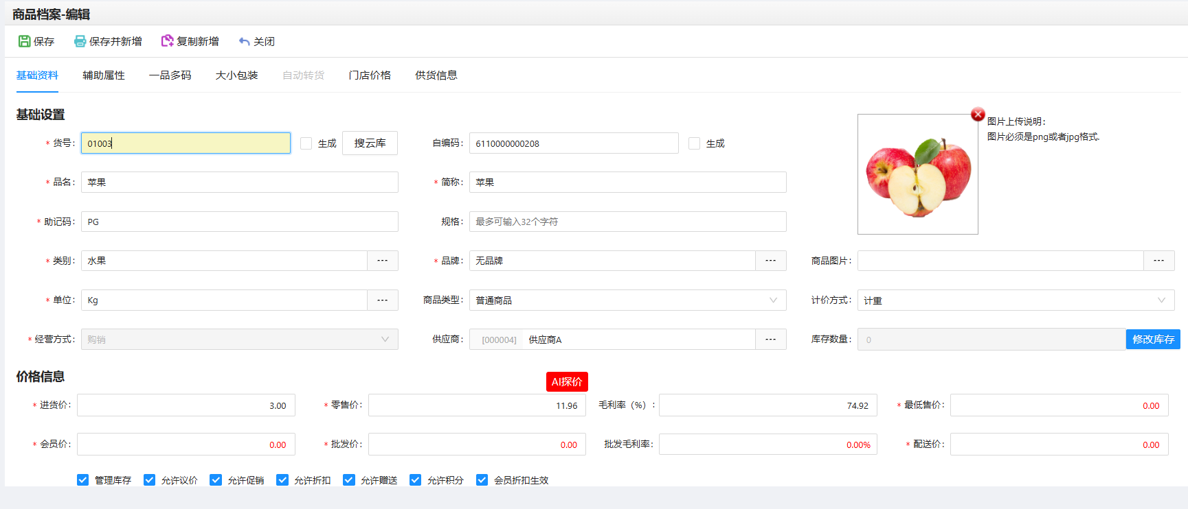 – 基础信息:类别;单位;品牌;产地;等级;生产日期;保质期;规格;进货规格