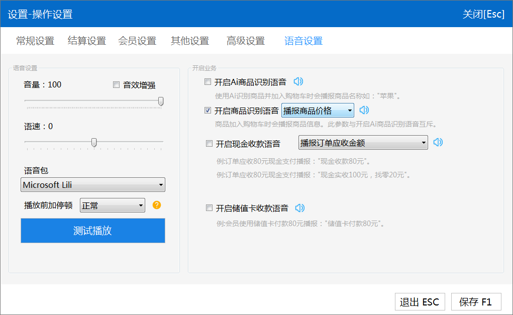开启商品语音识别:开启此参数后,可选择播报商品价格、商品品名,点选商品加入购物车后会播报商品名称或价格。