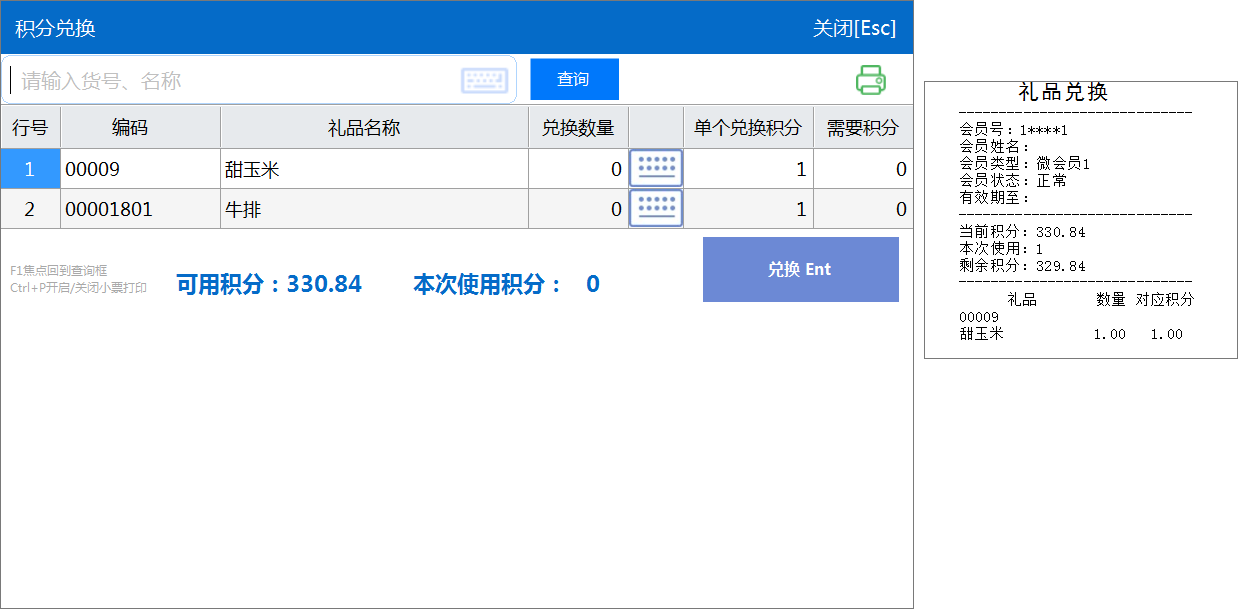 如当前查询会员有足够的积分,则会对应显示可兑换的礼品。如当前会员积分不足,则不会显示对应礼品,显示礼品过多时可通过货号或品名搜索。
