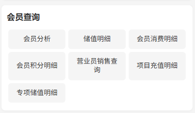 会员分析 储值明细 会员消费明细 会员积分明细 营业员销售查询 项目充值明细 专项储值明细