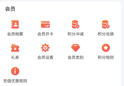 会员档案 会员开卡 积分冲减 积分兑换 礼券 会员设置 会员类别 积分规则 充值优惠规则