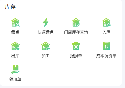 盘点 快速盘点 门店库存查询 入库 出库 加工 报损单 成本调价单 领用单