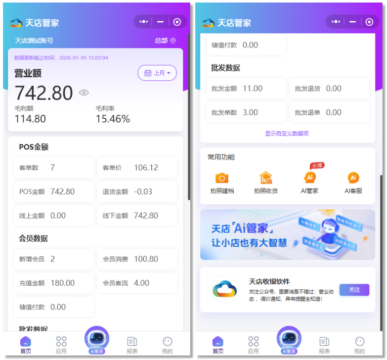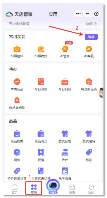常用功能包括 拍照建档、拍照收货、AI管家、AI客服,可进入【应用】模块自定义编辑常用功能。