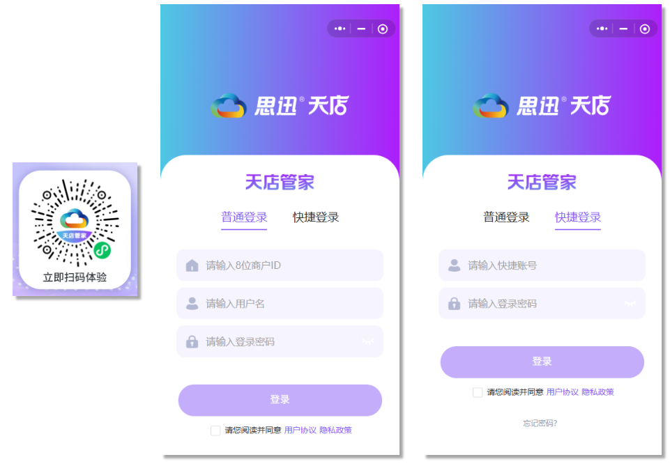 支持 普通登录(商户ID+账号+密码) 和 快捷登录 (后台绑定的手机号+密码) 登录使用