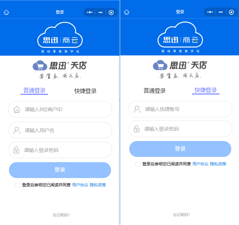 程序入口登录方式 程序入口管店支持:微信小程序 扫码 和 下载安卓系统-天店管店APP。 如图所示 登录方式支持 普通登录(商户ID+账号+密码) 和 快捷登录 (后台绑定的手机号+密码) 登录使用 如图所示 文档更新时间: 2025-12-18 09:34 作者:lixq